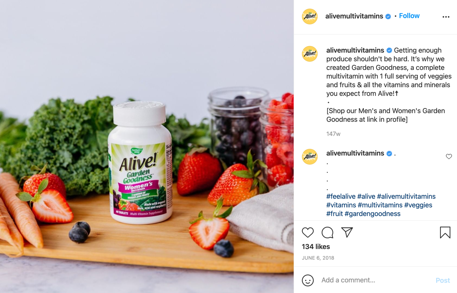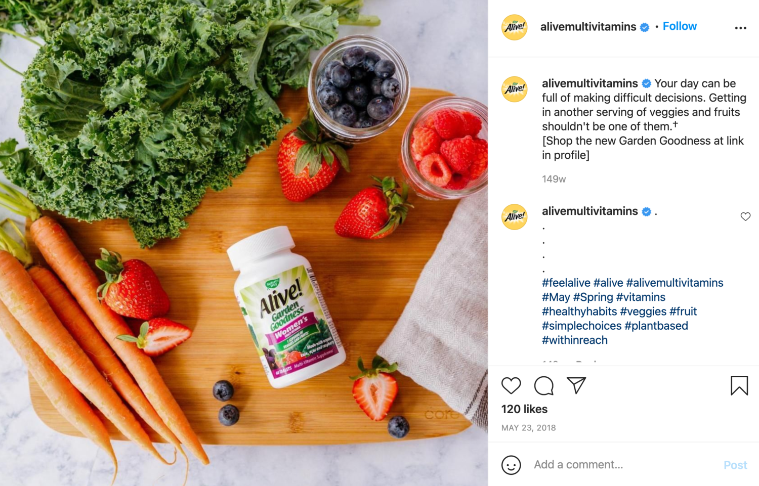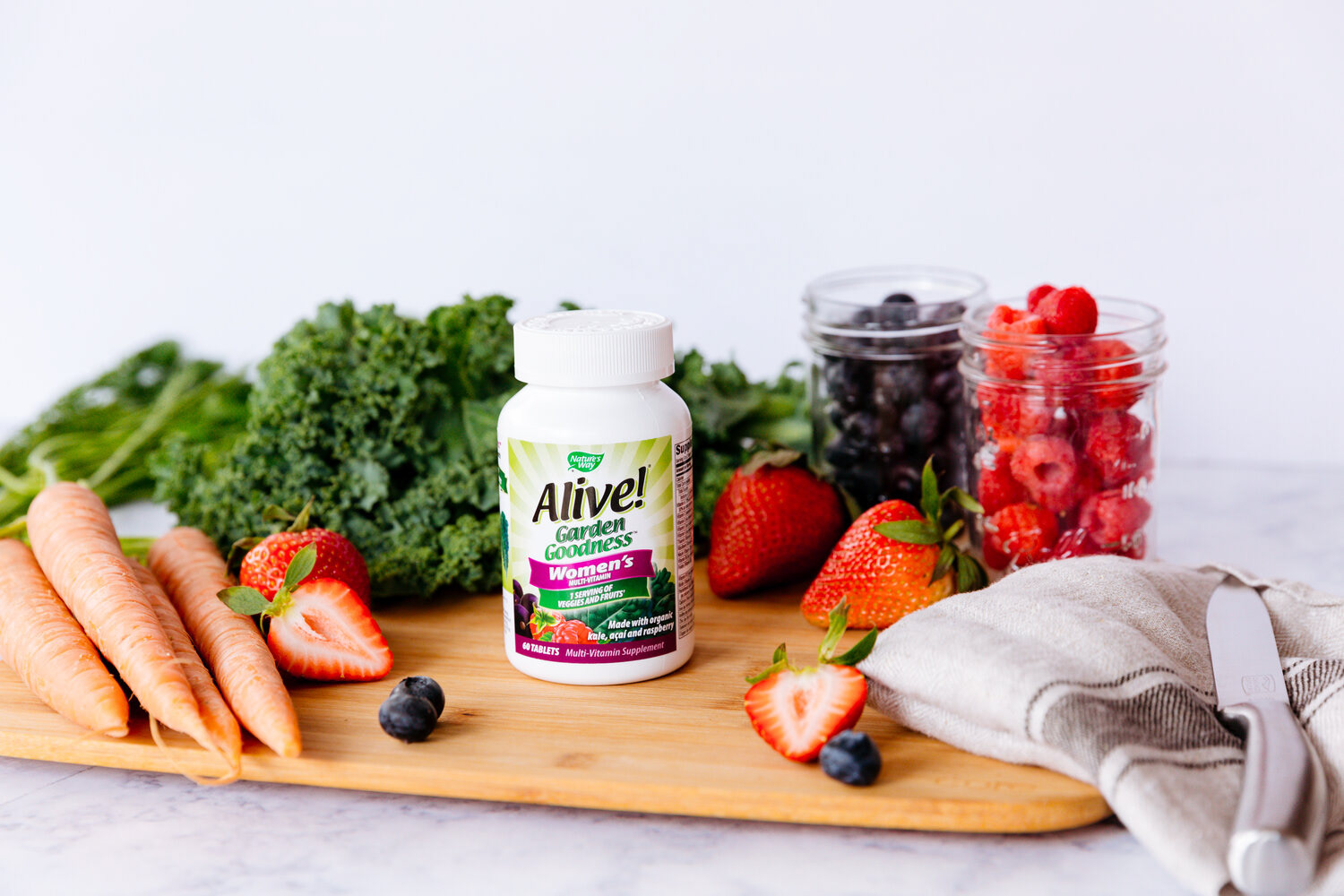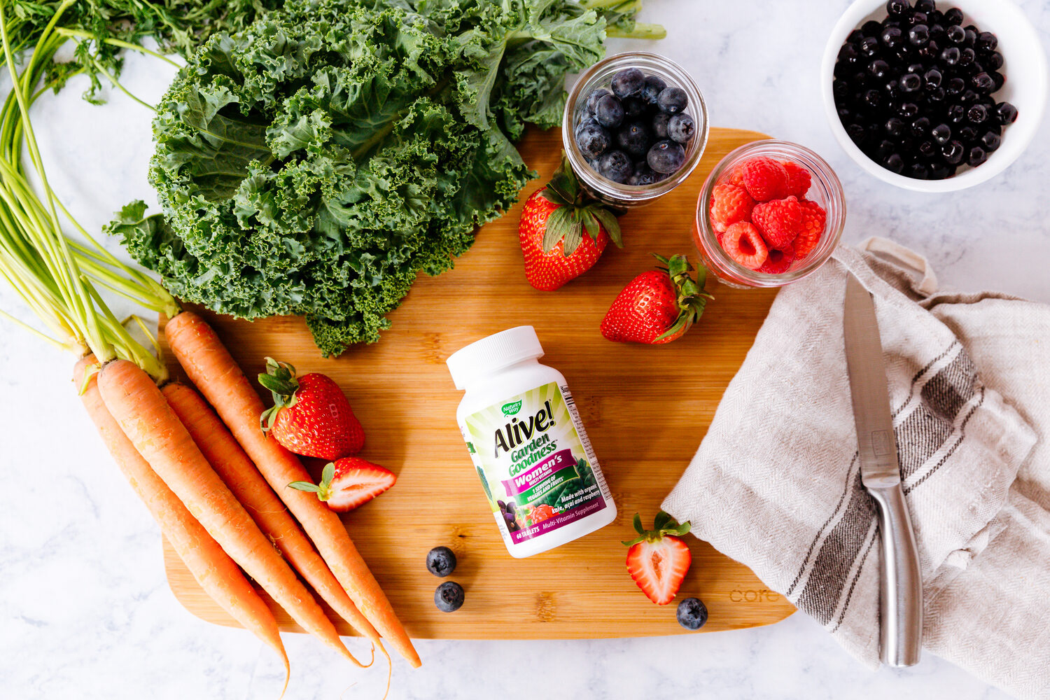 Created to showcase the main ingredients in Alive Multivitamins (Kale, Acai, + Raspberry) along with lifestyle shots that embody the product offering. These images were used for social media.